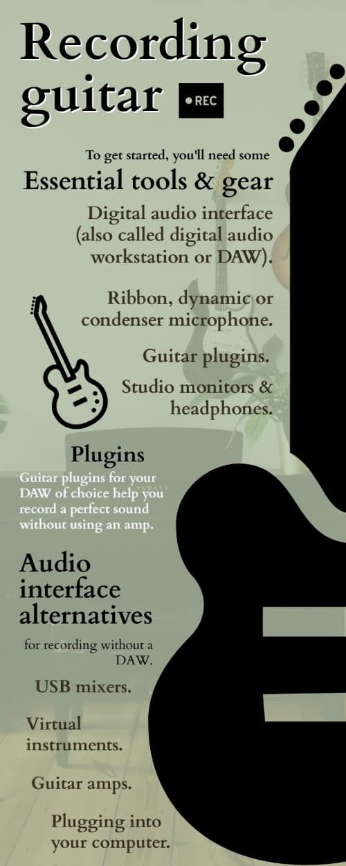 The latest technological advancements allow the production of excellent recording equipment at very affordable prices - and in smaller sizes. Recording guitar only requires a few specific tools, most of which come in a wide range of price points and sizes to fit your home studio.