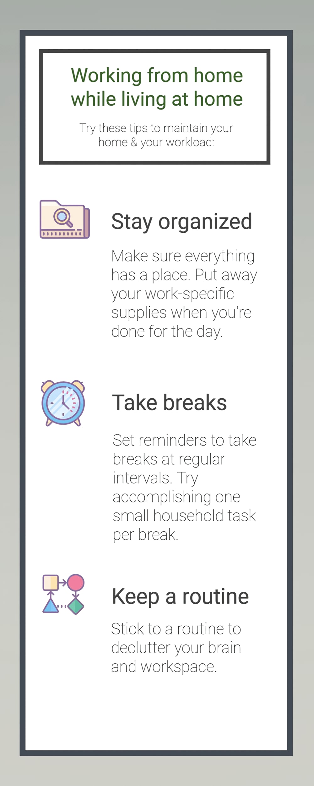 These are just a few work-from-home tips to keep your home free of clutter while you stay productive. Try incorporating other chores into your daily work routine and break schedule to find out what other home duties you can accomplish without scheduling extra time to do them.